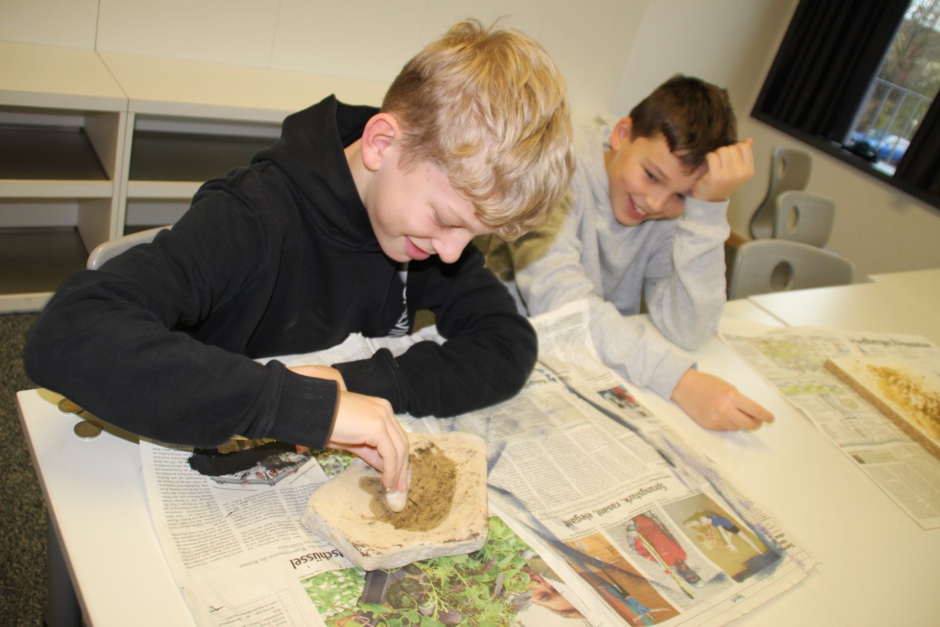 Am 03.12.2024 besuchte uns ein Archäologe auf Einladung des Geschichtsteams in JGS 6. Herr Breinl, der schon ein Jahr zuvor bei uns zu Besuch gewesen war, brachte allerlei Utensilien und Anschauungsobjekte mit. Nach einem interessanten Vortrag über das Leben in der Steinzeit, in dem er unter anderem über die Kunst des Feuermachens sprach, konnten die Schülerinnen und Schüler der 6. Klassen in Workshops steinzeitliche Waffen, Schmuck und Kunst selbst herstellen. Das Experimentieren und Gestalten bereitete allen sichtlich Spaß, wobei vor allem das Kreisen der Klanghölzer, das Pfeilbasteln und das Schleifen der Muschelanhänger Eindruck machten. Dabei zeigte sich, dass eine Dreiviertelstunde manchmal doch viel zu schnell vorbeigehen kann.